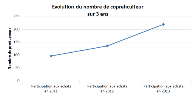 Cette augmentation de livraison est en relation avec l’augmentation du nombre de producteurs sur ces trois années. Entre 2011 et 2013, le nombre de producteurs a été multiplié par deux passant de 97 à 219. Cependant, il reste à fidéliser les producteurs de cette filière. En effet, seul un petit nombre vend de manière régulière à l’huilerie-savonnerie.